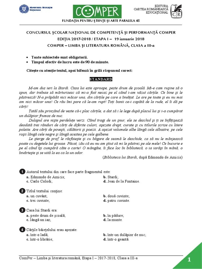 Aveți mai jos subiectele și baremele de corectare date la toate edițiile de la concursurile comper la matematică și română pentru clasa pregătitoare clasa 0 … ③ cerinţele vor fi citite de învăţător. I) (contine editie digitala) 11,90 lei. ②timpul efectiv de lucru este de 40 de minute. Culegerile de la editura campion, sunt exact ceea ce cauta elevii si profesorii.③ cerinţele vor fi citite de învăţător.