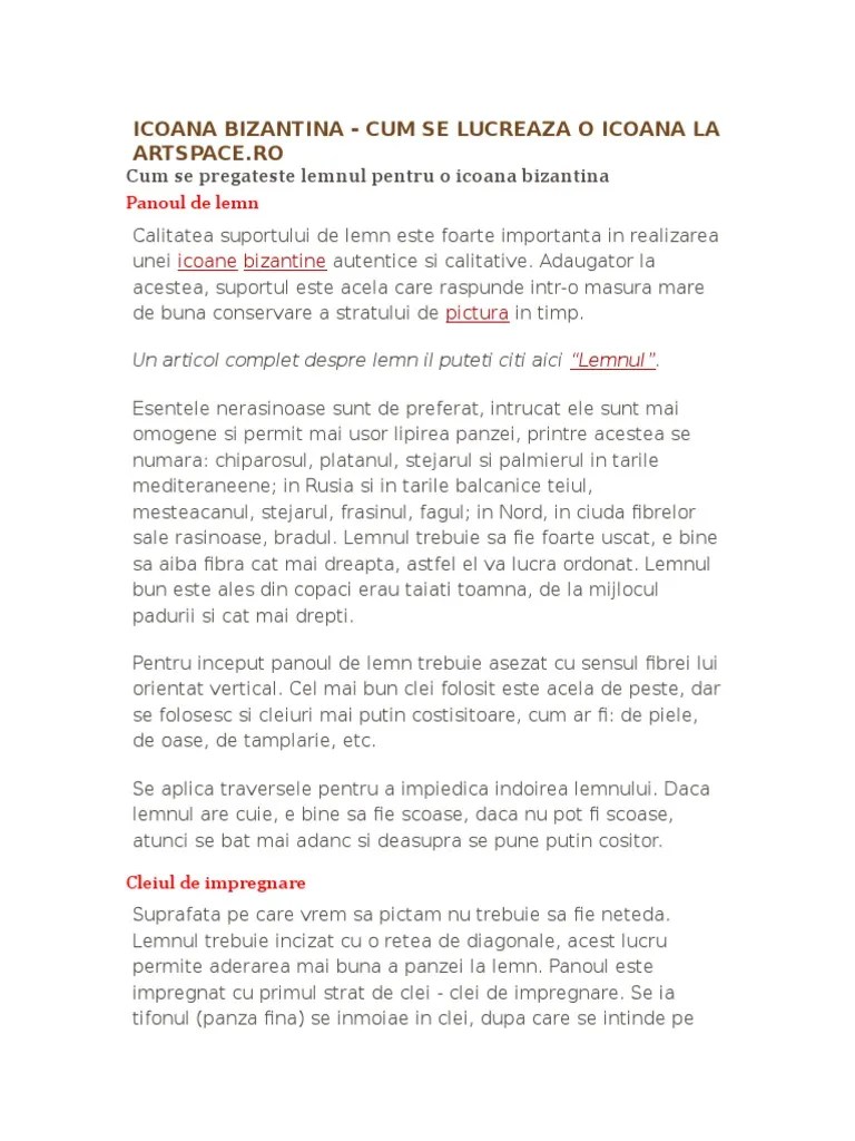 Icoanele prezentate pe acest site sunt realizate pe lemn de tei, pregătit după tehnica tradițională cu pânză și grund. Culoarea la randul ei este diluata cu emulsie de galbenus de ou. Se folosesc pigmenți de cea mai bună calitate ( din grecia) și foiță de aur. Vizitato dum aug 02, 2009 11:19 am. Icoanele prezentate pe acest site sunt realizate pe lemn de tei, pregătit după tehnica tradițională cu pânză și grund. Calitatea suportului de lemn este foarte importanta in realizarea unei icoane bizantine autentice si calitative. În realizarea icoanelor, se respectă.. În realizarea icoanelor, se respectă.