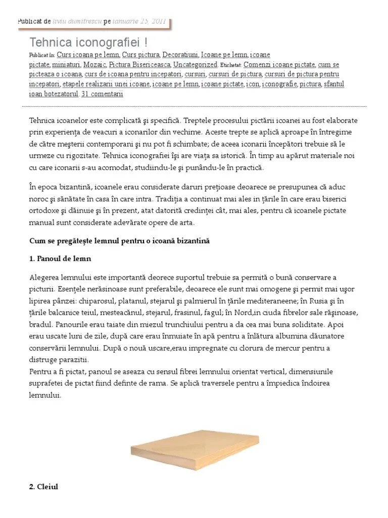 Icoanele prezentate pe acest site sunt realizate pe lemn de tei, pregătit după tehnica tradițională cu pânză și grund.. Icoanele prezentate pe acest site sunt realizate pe lemn de tei, pregătit după tehnica tradițională cu pânză și grund. Calitatea suportului de lemn este foarte importanta in realizarea unei icoane bizantine autentice si calitative. Vizitato dum aug 02, 2009 11:19 am. Icoanele prezentate pe acest site sunt realizate pe lemn de tei, pregătit după tehnica tradițională cu pânză și grund. Un clip ce comprima o zi de lucru in 3 minute. Icoanele sunt pictate in tehnica "a secco", pe o catapeteasma de zid.