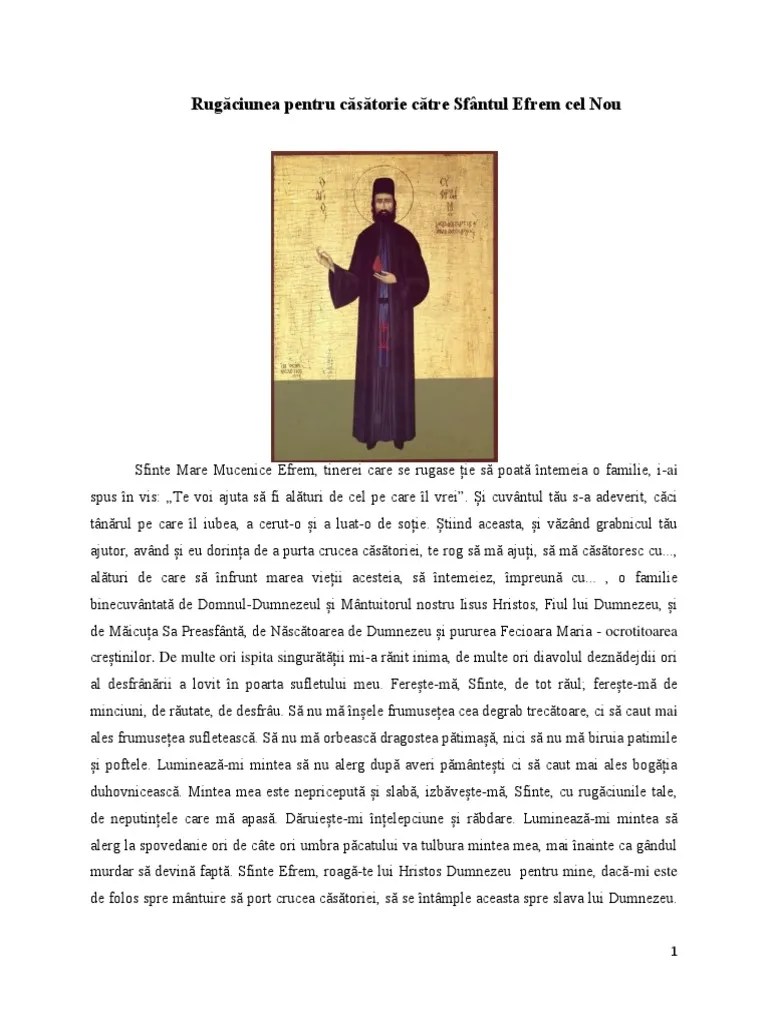 Ajută, sfinte efrem, pe cei care zac în patimi, robiţi de nepocăinţă şi trândăvie, pe cei ce sunt în necazuri. Ajută, sfinte efrem, pe cei care zac în patimi, robiţi de nepocăinţă şi trândăvie, pe cei ce sunt în necazuri. Te voi ajuta sa fii alaturi de cel pe care il vrei. Cununia este o taina sfânta, un dar pe care îl primesc doar cei alesi. Mai este putin pana pe 6 decembrie 2016, cand crestinii ortodocsi il praznuiesc pe sfantul nicolae, unul dintre cei mai populari sfinti din calendar. 18.05.2012 · rugaciune pentru casatorie 5.00 / 5 din 4 voturi. Rugãciune pentru câstigarea unui proces. Stiu ca fericirea mea cea mare sta in a te iubi cu tot sufletul meu si cu toata inima mea si in a implini intru totul sfanta voia ta.. Asadar, tu insuti indruma, dumnezeule, sufletul meu si umple inima mea: